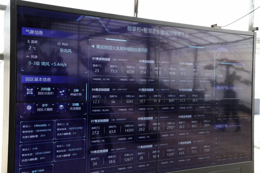 和王浩一样,杨凌青皮她园火龙果示范基地也安装了“棚掌柜”,这里的智能化程度更高,系统集成技术也更强大。棚内的电子屏上,基地基本信息、卷帘机工作情况、各棚的气象信息、温度、湿度、光照等数据一目了然。这些数据与基地紧密相关,指导着基地内日常生产。