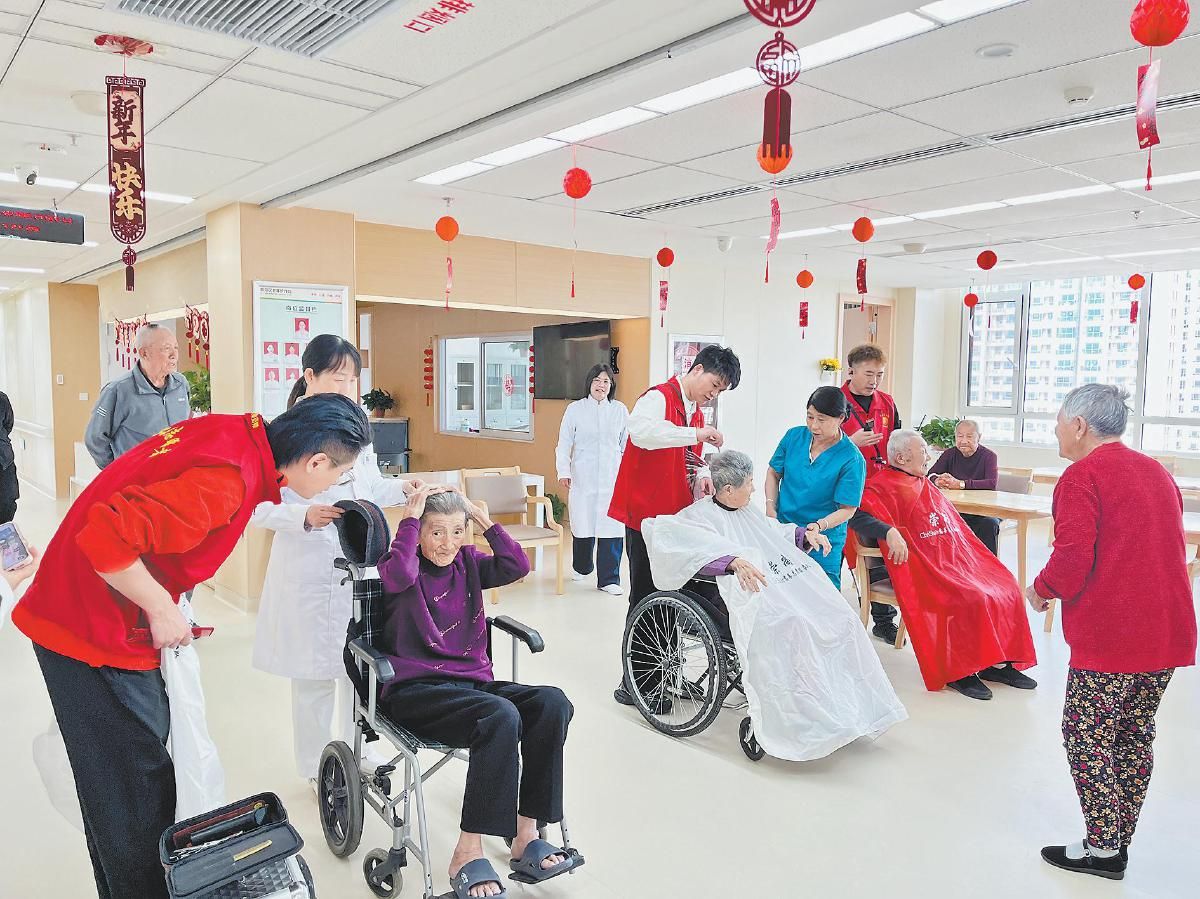 4月1日,在榆林高新医院老年护理院,榆林青年慈善志愿服务队队员为老人们义务理发。
