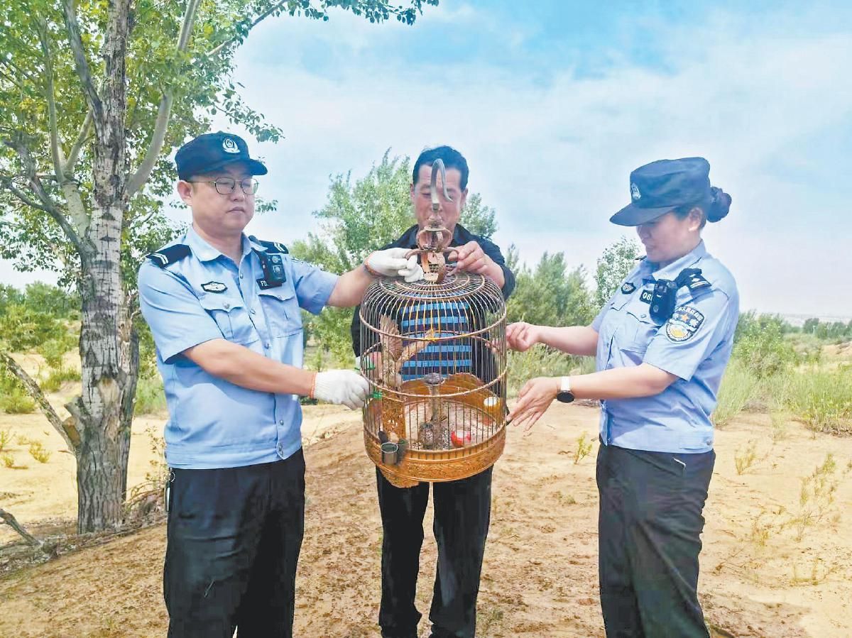 民警和野生动物保护站的工作人员放飞国家二级保护动物蒙古百灵(资料照片)。