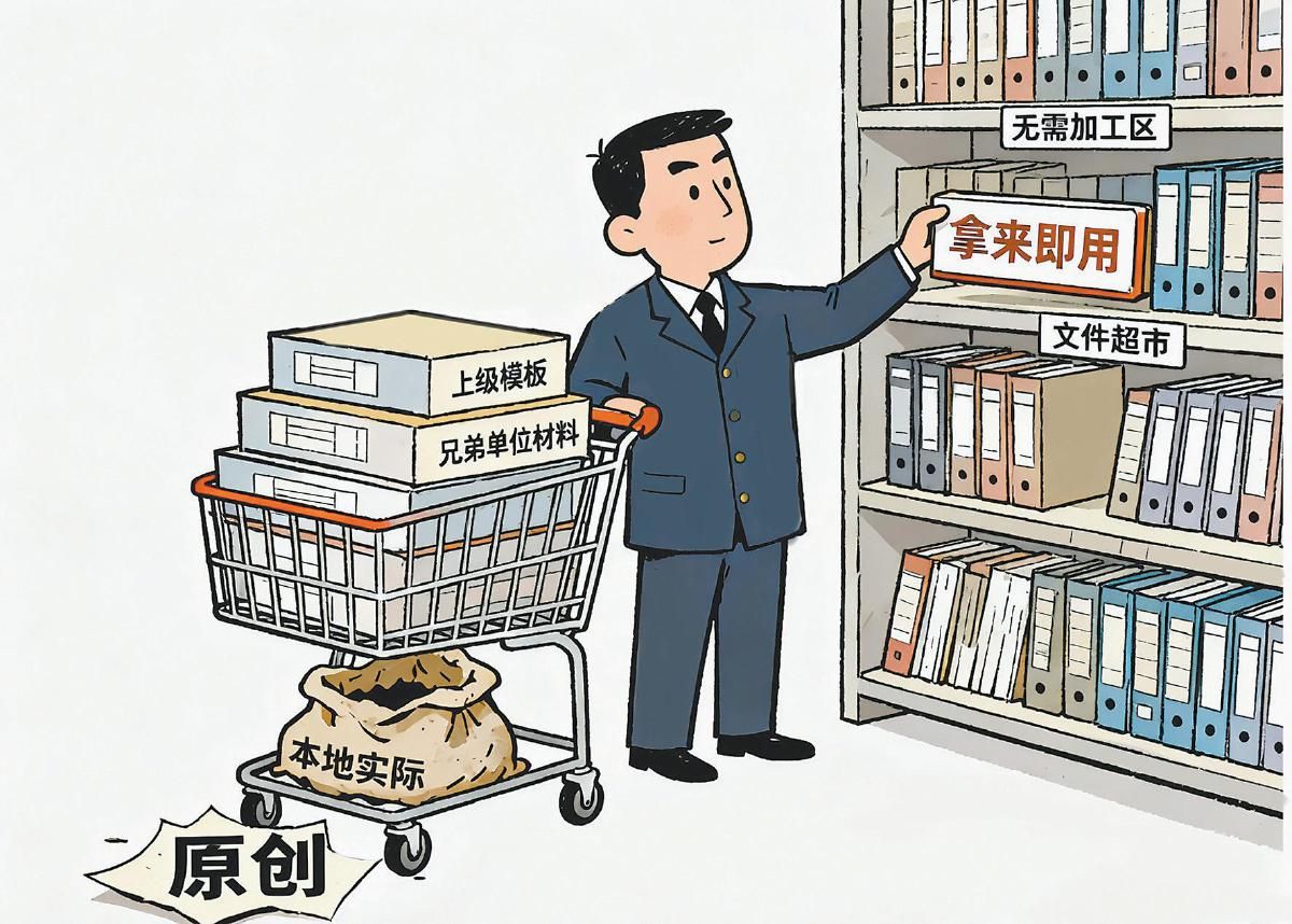 材料“拿来即用”,本质是敷衍塞责的懒政行为。当下,部分干部习惯套用上级模板、照搬兄弟单位材料,将本地实际和原创思考弃之不顾。这种做法让材料失去了针对性,沦为脱离实际的空文,既阻碍工作精准推进,又掩盖基层真实情况。