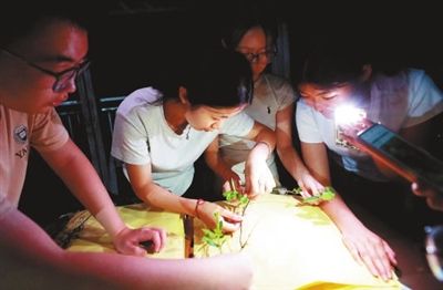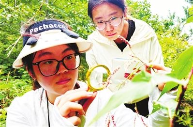 学生们在观察、记录药用植物形态特征。