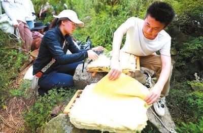 采药途中,两名学生合作压制植物标本。