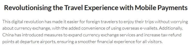 文章进一步分析称,这场“数字革命”让外国游客无需操心货币兑换,便可轻松享受旅程,还可直接使用海外电子钱包,便捷性进一步提升。此外,中国还推出了多项便利措施,包括扩大货币兑换服务覆盖面、增加离境机场退税点等,为所有游客打造更顺畅无忧的支付体验。