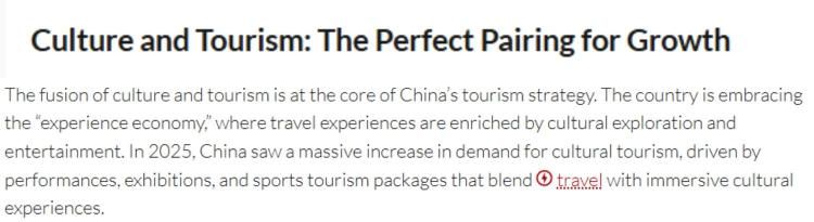 文章认为,文旅深度融合是中国旅游发展战略的核心。当前,中国正积极拥抱“体验经济”,通过文化探索与娱乐休闲为旅行体验注入更丰富的内涵。在文艺演出、主题展览以及将旅行与沉浸式文化体验相结合的体育旅游套餐的推动下,中国文化旅游需求大幅增长。