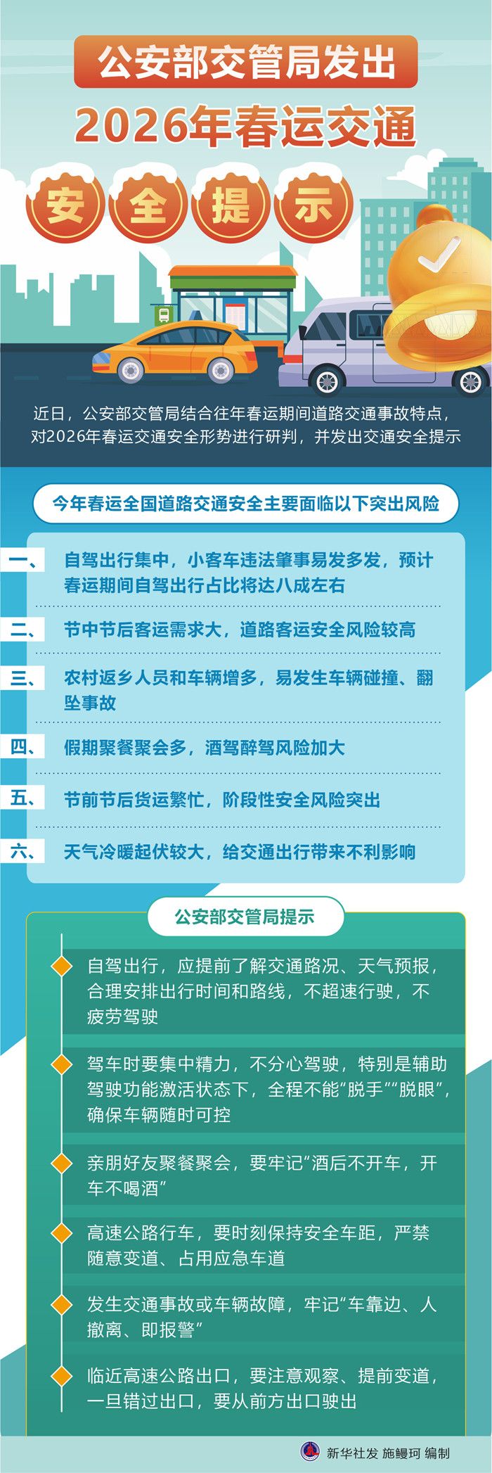 新华社北京1月30日电 记者1月30日从公安部获悉,近日,公安部交管局结合往年春运期间道路交通事故特点,对2026年春运交通安全形势进行研判,并发出交通安全提示。
