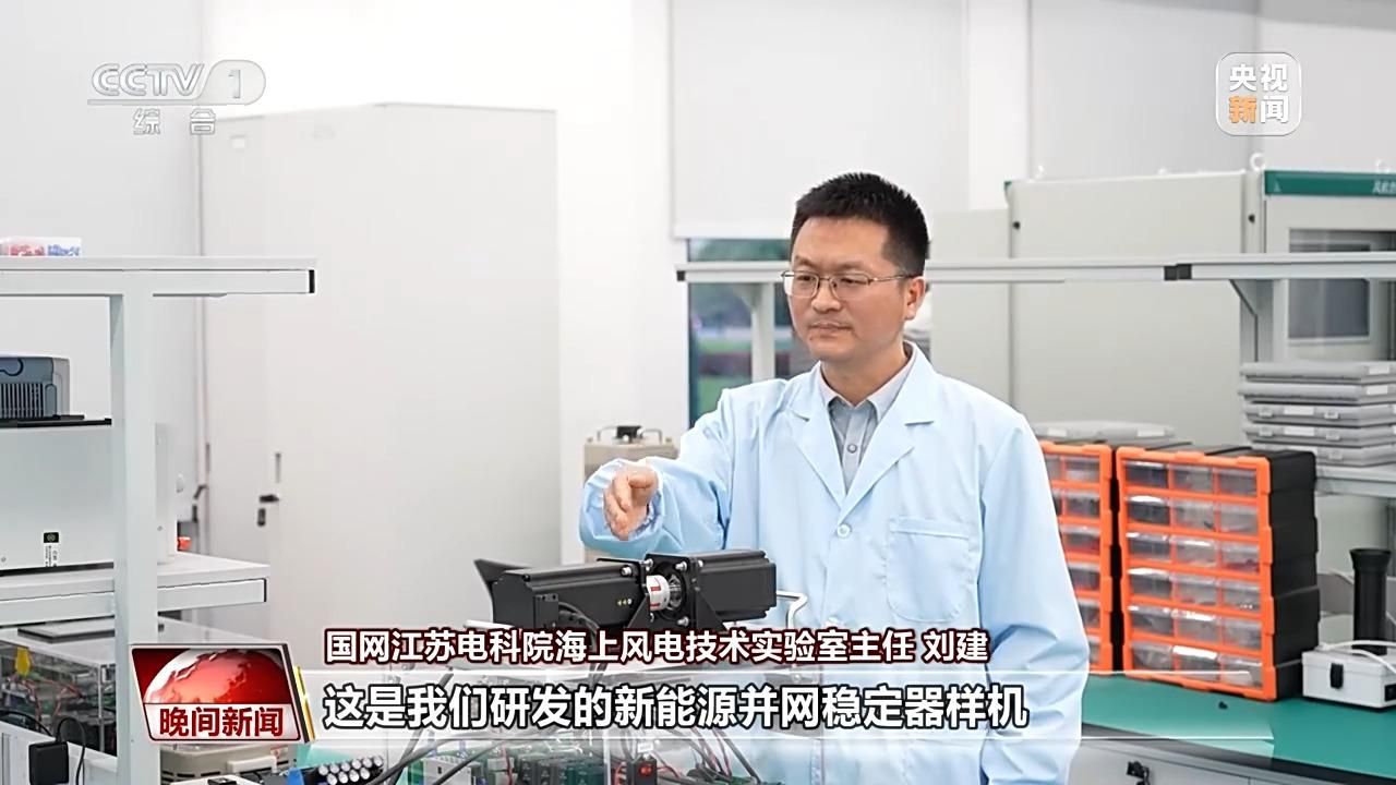 国网江苏电科院海上风电技术实验室主任 刘建:这是我们研发的新能源并网稳定器样机,就像给转速波动的风机装上“稳压器”,让输出的电平稳可靠。