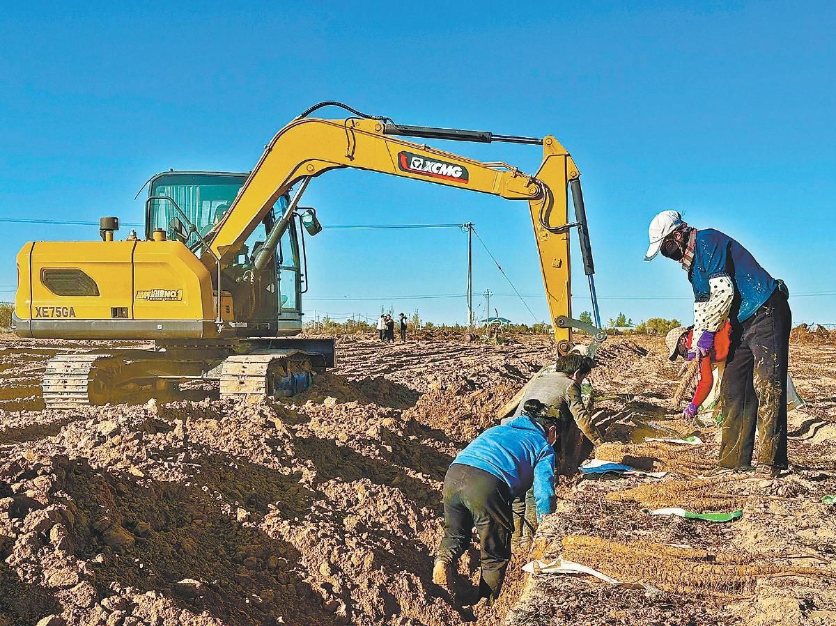 近日,定边县砖井镇侯场村的3000多亩山药进入集中采收期。田间地头,大型挖掘机来回穿梭,铁铲深入土层,精准翻挖后,一根根粗壮饱满的山药破土而出。工人们紧随其后,熟练地将山药捡拾、清泥、码放,等待装车销售。