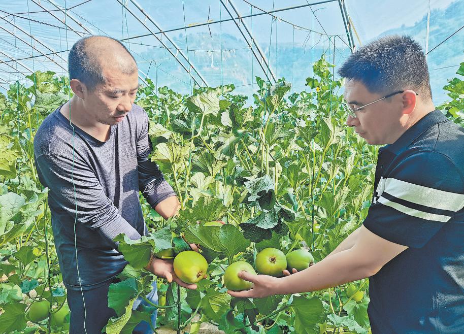 查看大棚香瓜长势 通讯员 邓聪 摄