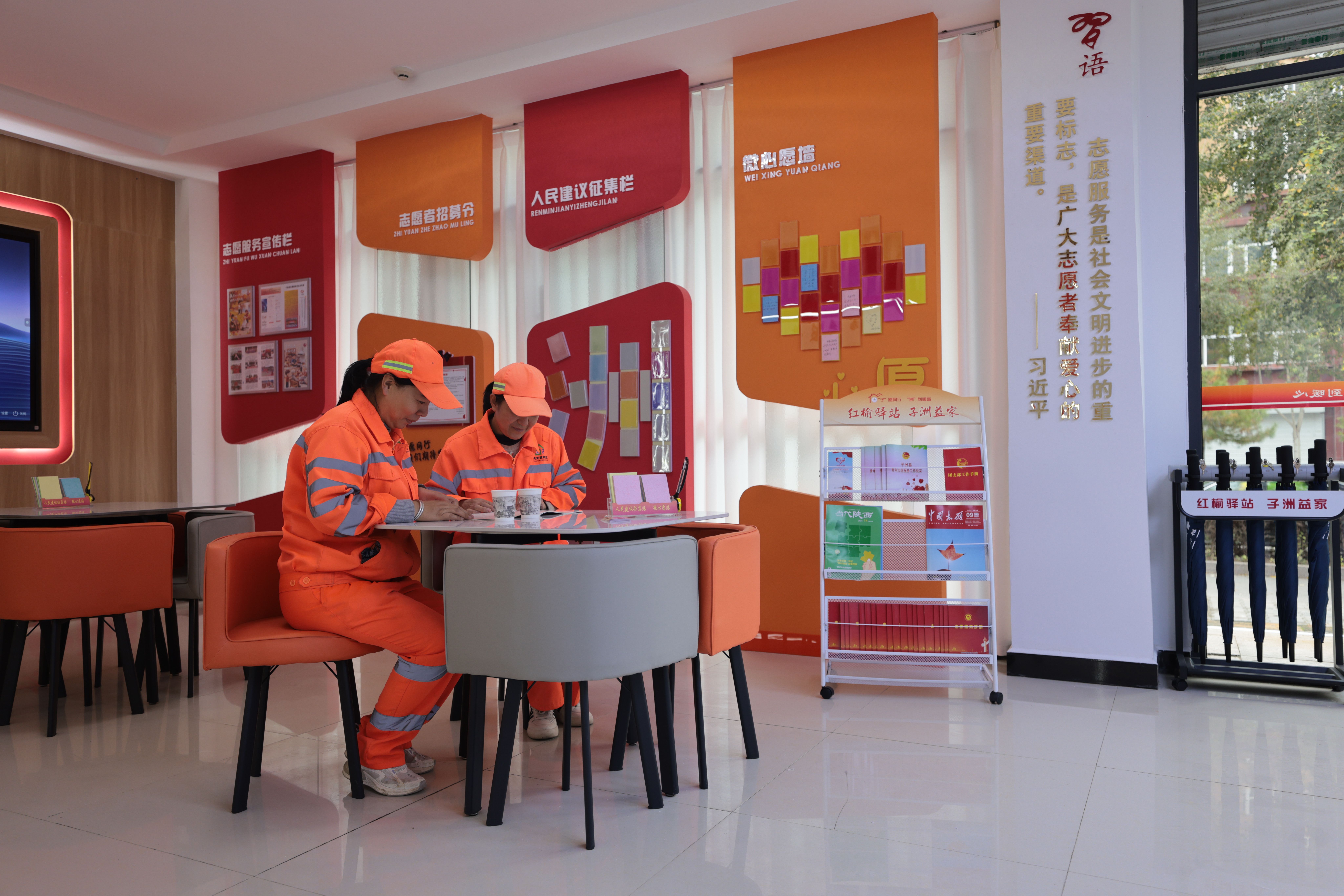 环卫工人在“红榆驿站”服务点内喝水休息。郑懿 摄