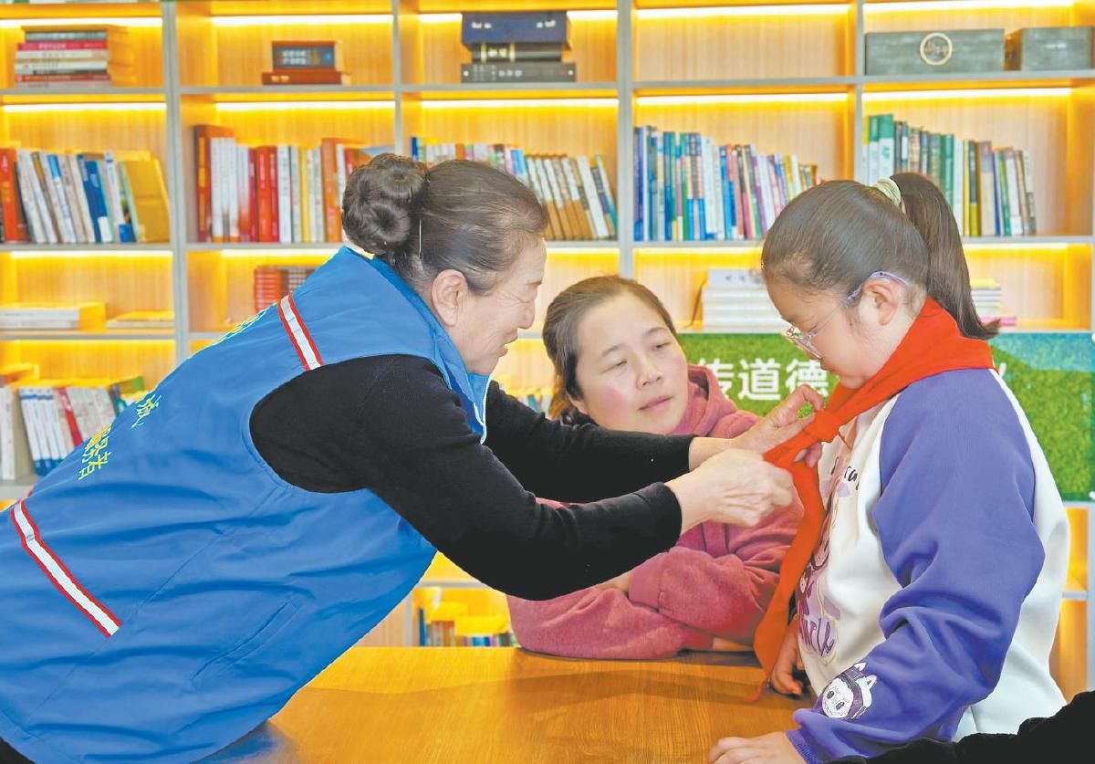 贺莎莲(左)为“禾苗课堂”学生佩戴红领巾。周海月 摄