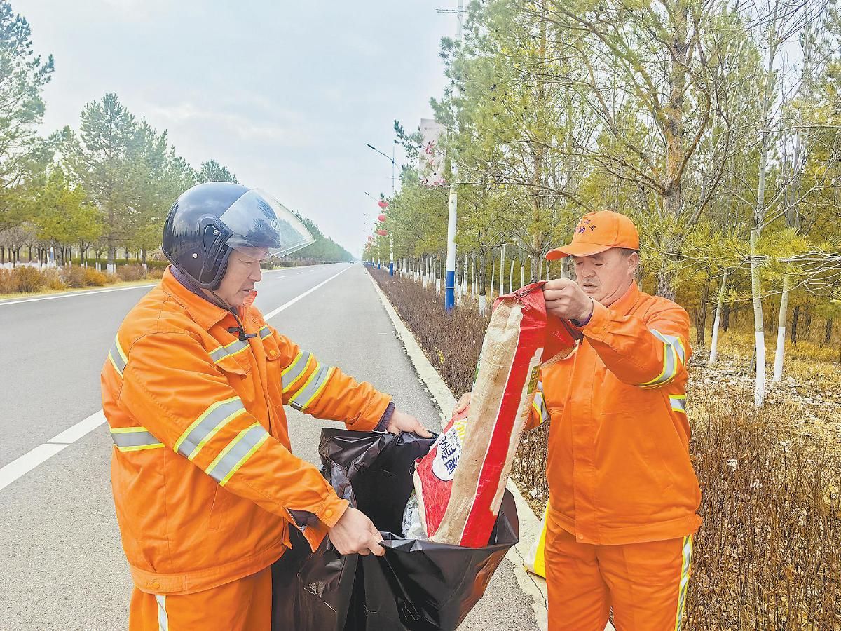 张银山(右)和同事一起清理垃圾。李小强 摄