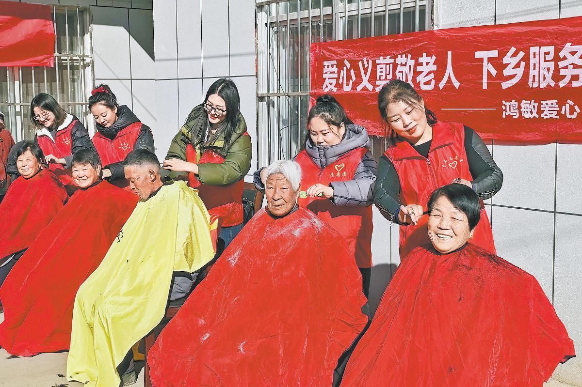 图为志愿者为老人们义务理发。