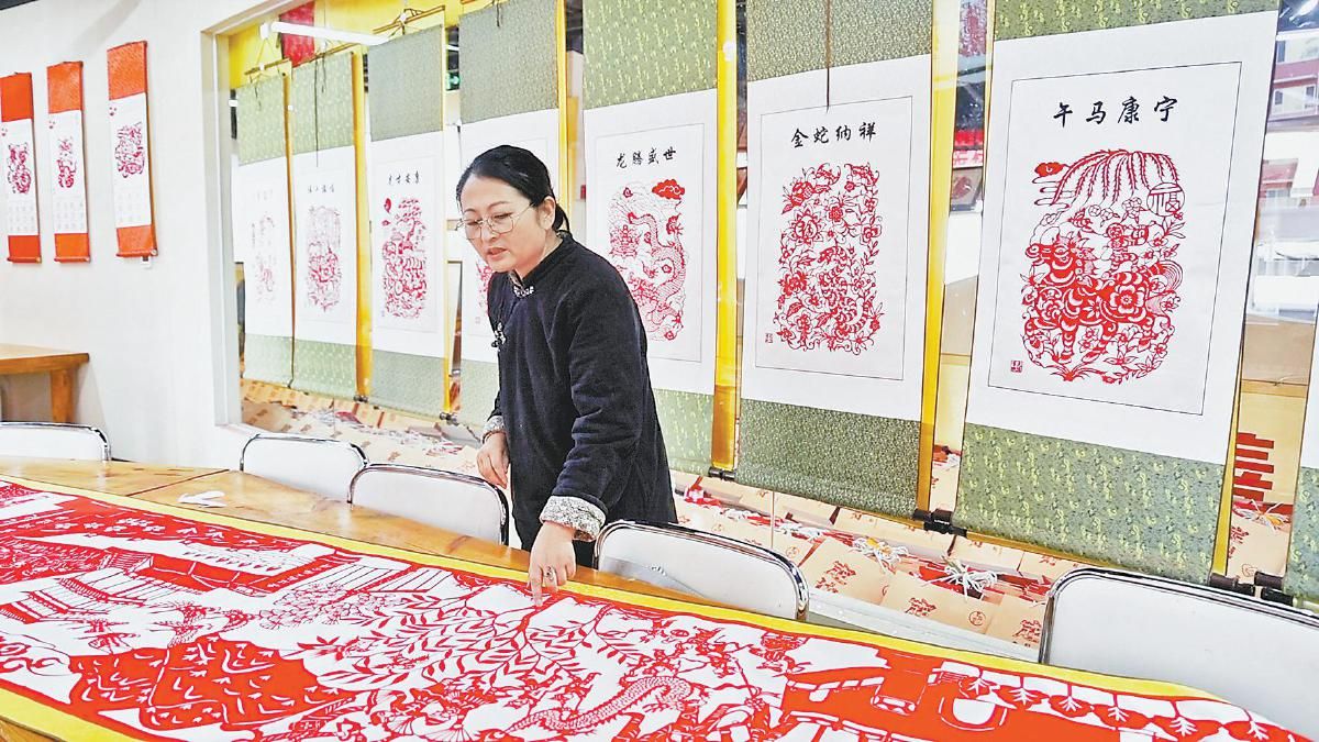 图为侯志萍介绍自己创作的剪纸长卷。 武艳萍 摄