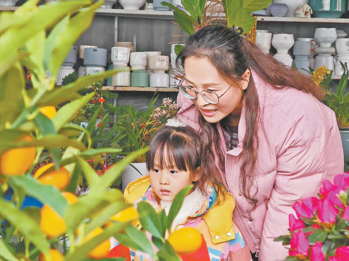 图为市民带着孩子在观赏花卉。 李世逵 摄