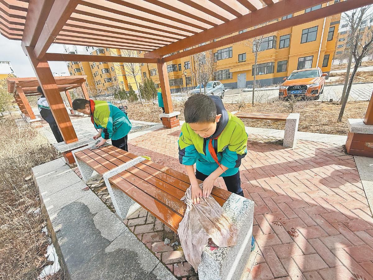 图为学生们在擦拭长廊座椅。魏靖博 摄