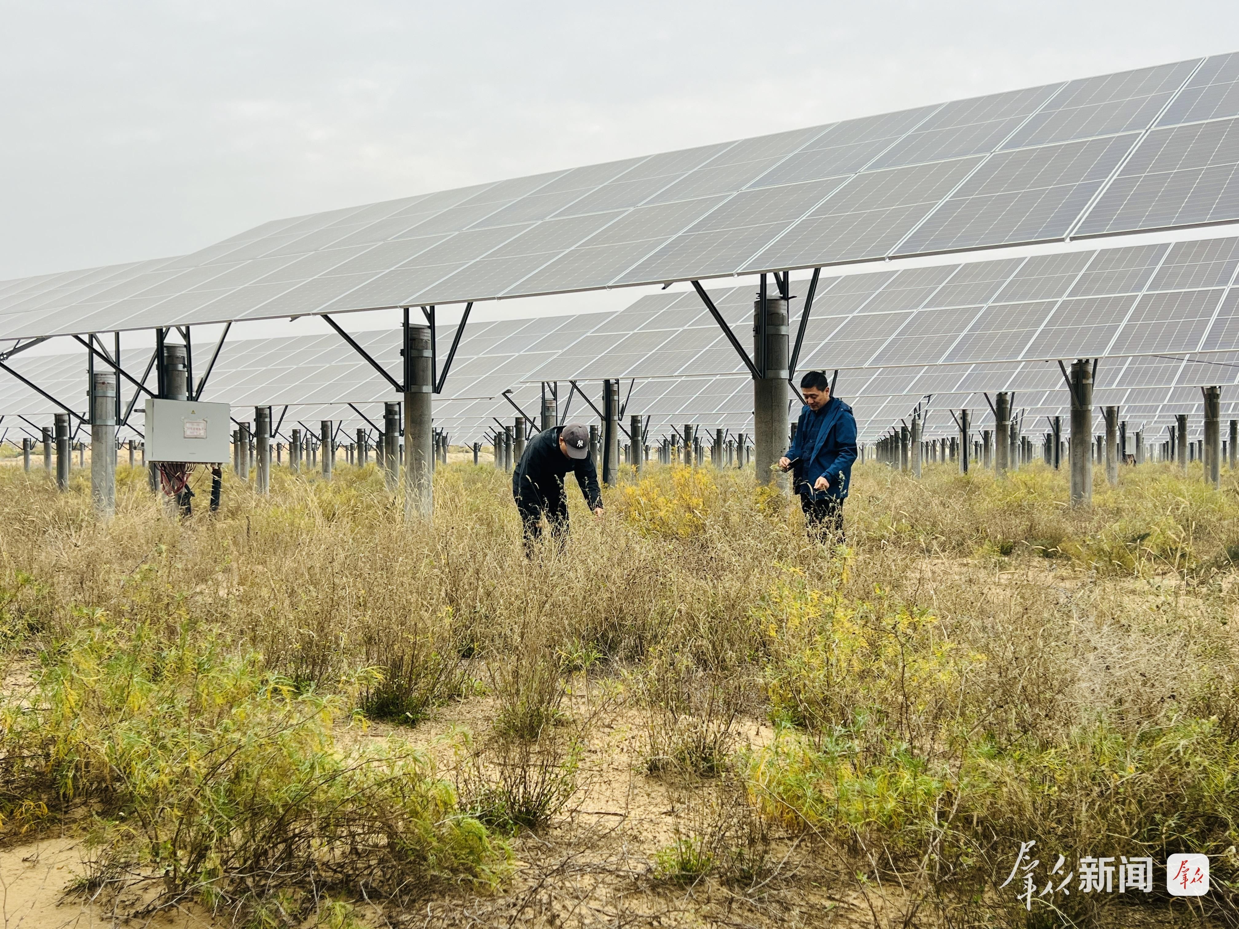 12月5日,在陕西省榆林市榆阳区的孟家湾光伏电站,冬日的阳光倾泻而下,在蓝色光伏板上泛起粼粼波光。板下,并非想象中的裸露沙地,而是一片由紫花苜蓿、沙打旺、虎尾草等植物组成的一层高达十余厘米、黄绿相间的植被。