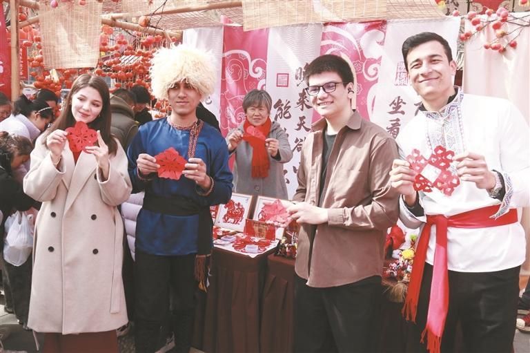 剪纸展示台前,西安剪纸非遗代表性传承人陈新峰指尖翻飞,片刻之间,喜鹊登梅、福字迎春等精美图案跃然纸上。市民和中亚留学生围在桌前,认真学习折、剪、刻技巧,一张张红纸在他们手中变成了窗花、福字。