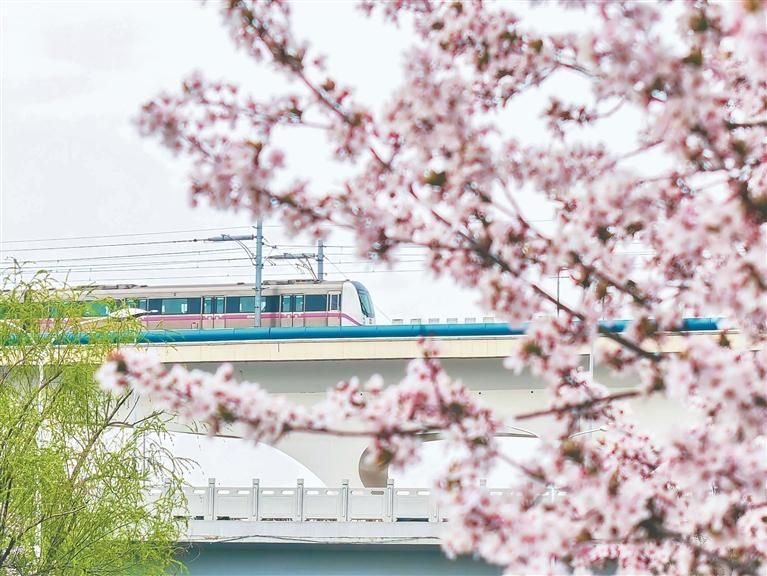 在西安地铁3号线桃花潭站附近,列车穿行于盛放的花朵间,勾勒出“开往春天”的诗意画面(3月21日摄)。