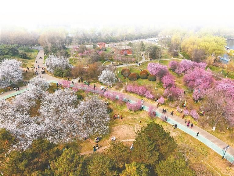 大明宫国家遗址公园内,梅花与杏花盛开(3月20日摄)。