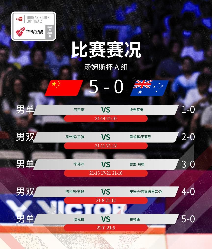 新华社丹麦霍森斯4月24日电(记者周欣、张玉亮)2026年汤姆斯杯暨尤伯杯决赛圈比赛24日在此间揭幕,在小组赛首轮较量中,卫冕冠军中国男队、女队均以5:0战胜对手,收获“开门红”。