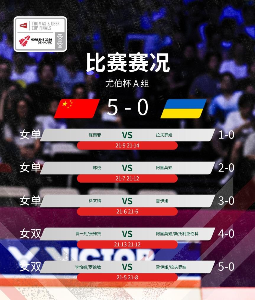 女队方面,中国队同样以头号种子身份出战,与印度、丹麦和乌克兰队同处A组。首轮迎战乌克兰队前,中国队高喊“凝心聚力、势不可挡”为自己鼓劲。比赛中,中国队迅速进入状态,陈雨菲、韩悦、徐文婧三位单打选手确立了领先优势。随后,贾一凡/张殊贤和李怡婧/罗徐敏在双打中延续强势表现,中国队以五场全部直落两局的成绩锁定胜利。