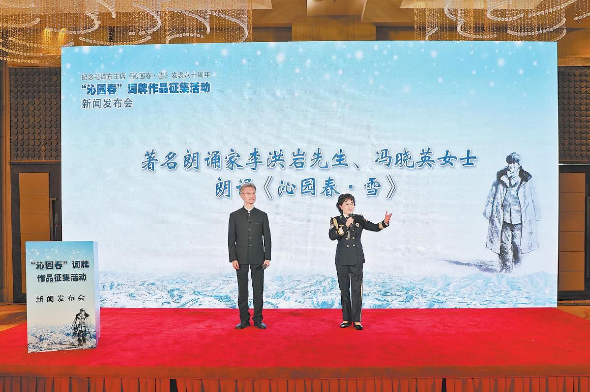 “北国风光,千里冰封,万里雪飘……”新闻发布会上,著名朗诵家李洪岩、冯晓英饱含深情地朗诵了《沁园春·雪》,现场听众再次领略到这首词的磅礴气势和深远意境,也传递出本次征集活动的诚挚邀请与时代强音。