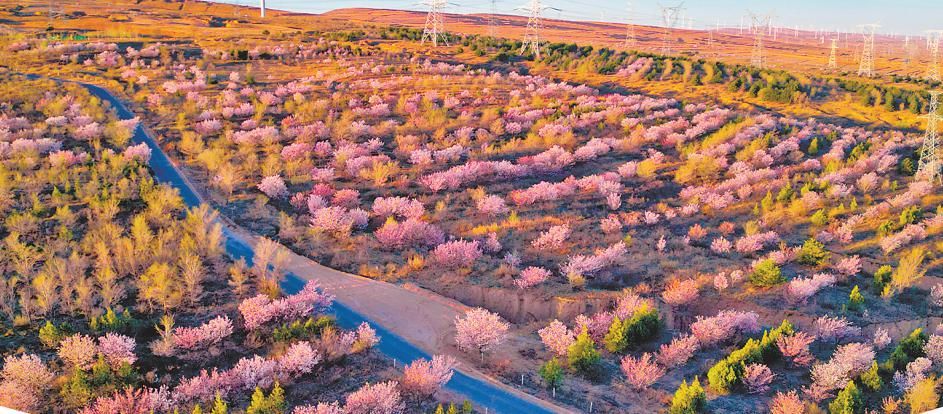 金黄的油菜花铺就春日盛景,素雅的苹果花缀满枝头,烂漫的樱花如云似雪,温润的杏花迎风绽放。各色繁花次第盛开,蜜蜂穿梭花间,采撷芬芳、酿造甘甜。塞上大地生机盎然的春日盛景,尽显乡村振兴的蓬勃活力与自然之美。