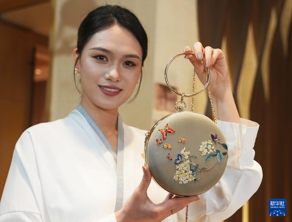 4月25日在外场展区拍摄的运用上海绒绣非遗技艺的文创产品。