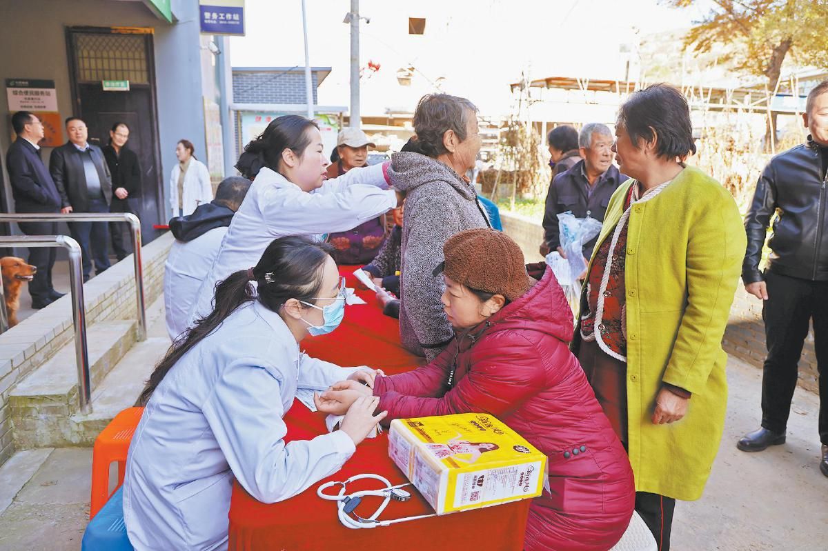 10月31日,子洲县卫健局联合双湖峪镇卫生院开展暖心义诊活动,将专业医疗服务与健康关怀送到基层群众“家门口”。这是医护人员为群众检查身体。