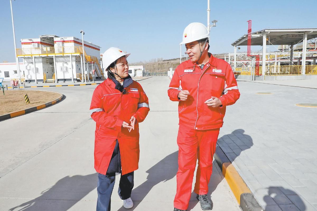 榆林传媒中心记者(左)采访中石油长庆油田榆37储气库作业区工作人员。记者 孙永波 摄