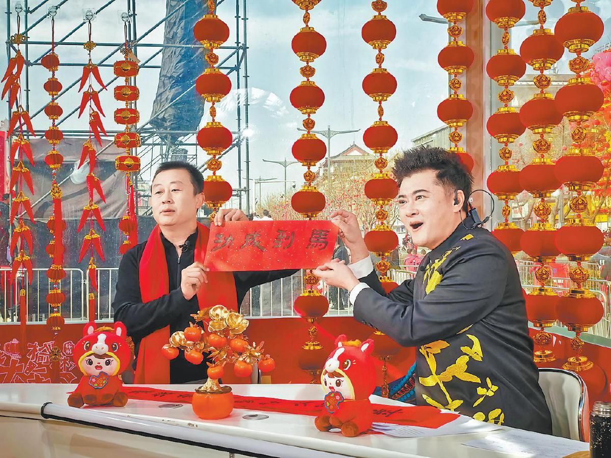 2026“陕北榆林过大年”秧歌展演中,榆林传媒中心主持人(右)在直播间与嘉宾互动。记者 田竹青 摄