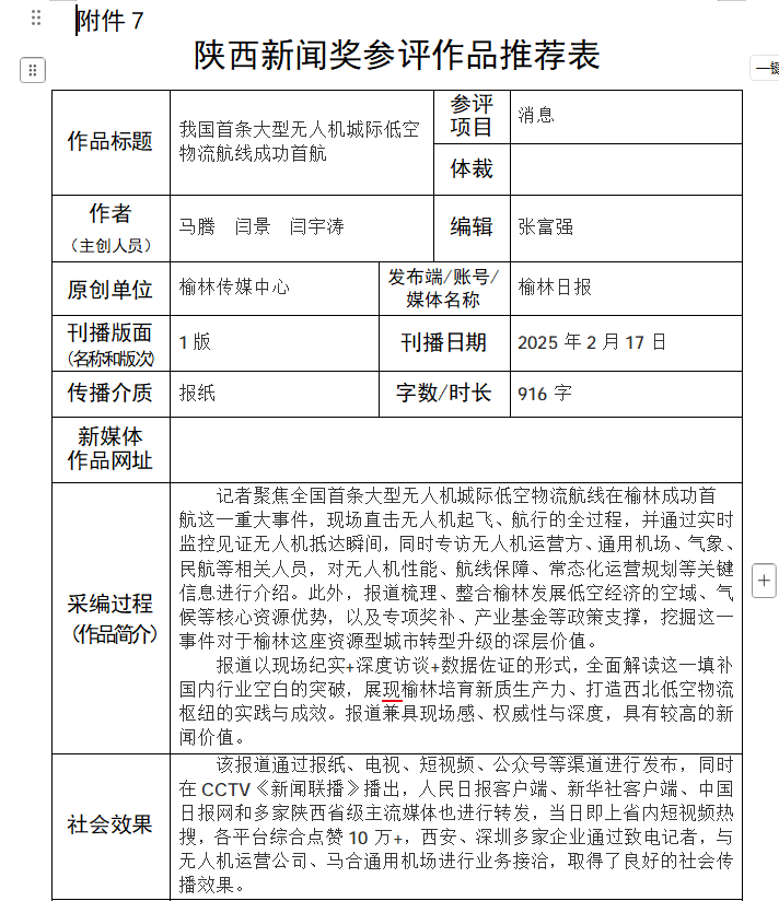 根据陕西省人力资源和社会保障厅、陕西省新闻工作者协会《关于开展陕西新闻奖、陕西省优秀新闻工作者奖评选表彰的通知》(陕人社函〔2026〕40号)要求,经我中心采编人员民主推荐,评委会评选,编委会审定,研究决定:报送《我国首条大型无人机城际低空物流航线成功首航》《“山村闺女”大林林:走村串户收山货 一半收益留乡里》《为什么是榆林?》等18件作品参加陕西新闻奖评选。