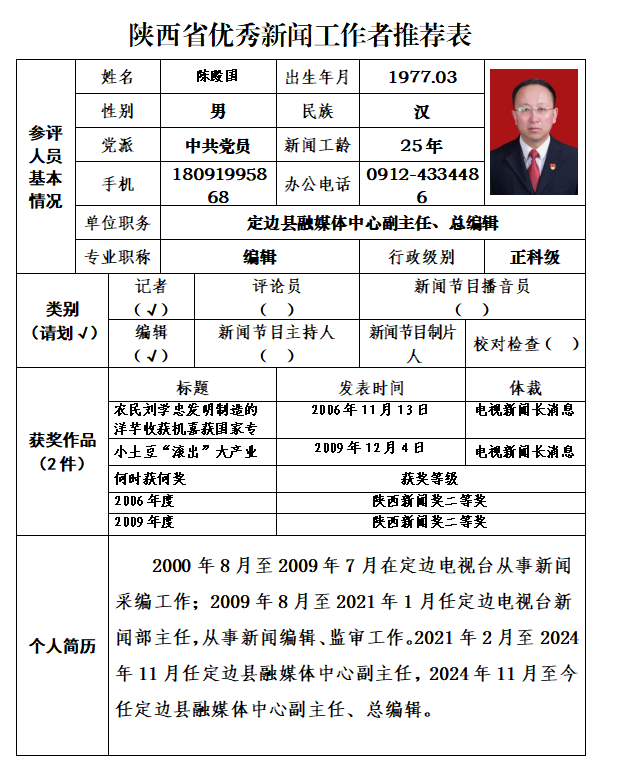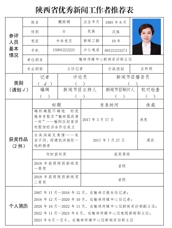 根据《陕西省人力资源和社会保障局 陕西省新闻工作者协会关于开展陕西新闻奖、陕西省优秀新闻工作者奖评选表彰的通知》的文件要求,经全市各新闻单位积极组织推荐、市记协组织专家初评,现拟推荐2人参评陕西省优秀新闻工作者。