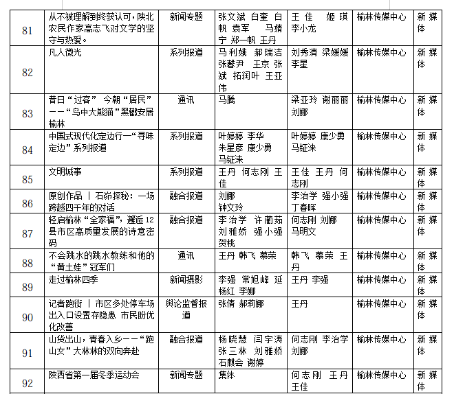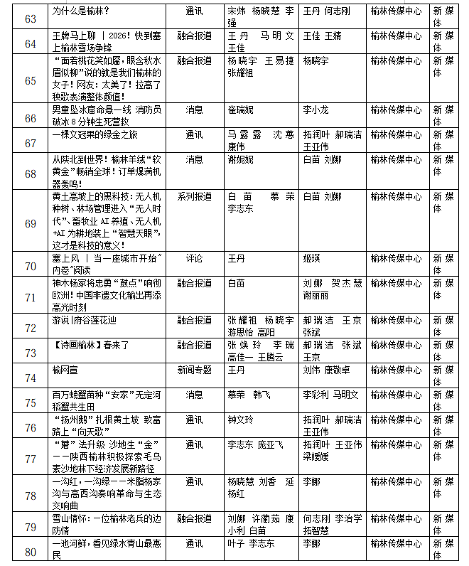 根据榆林市人力资源和社会保障局、榆林市新闻工作者协会《关于开展2025年度榆林新闻奖、榆林市优秀新闻工作者评选表彰的通知》(榆政人社函〔2026] 61号)要求,经我中心采编人员民主推荐,评委会评选,编委会审定,研究决定:拟推荐《神泉堡确证为“中国人民银行”名称诞生地 》等92件作品参评2025年度榆林新闻奖。
