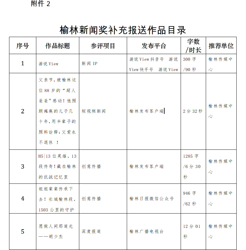 榆林传媒中心关于补充报送榆林新闻奖参评作品的公示