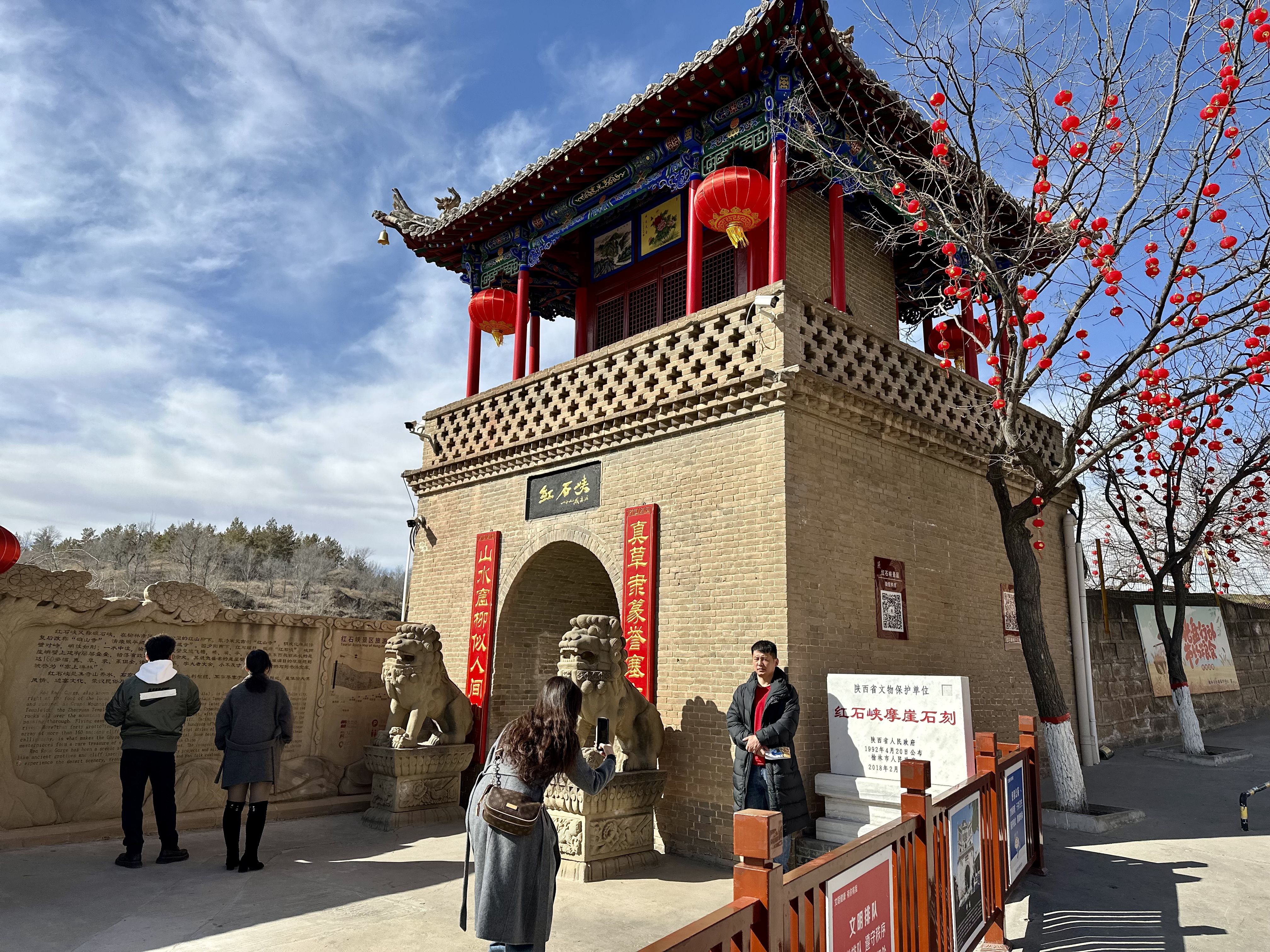 2月19日,红石峡景区内,摩崖石刻雄浑厚重,百米冰瀑晶莹剔透,冰瀑长廊、冰封玫瑰等景观壮美震撼,自然景观与历史文化交相辉映,吸引各地游客络绎不绝。榆林市长城保护中心红石峡文管所讲解员梁子娟介绍,截至正月初三,景区已接待游客约6000人次,游客群体以家庭游、省外游客为主。为应对假日客流,景区增派志愿服务力量,强化客流疏导、秩序维护与便民服务,全力保障游览安全顺畅。来自河北廊坊的游客邢先生带着一家16口人来榆林探亲,将红石峡作为游玩第一站,对这里的景观赞不绝口。他表示,接下来还要在榆林停留几日,欣赏陕北秧歌,感受塞上年味。