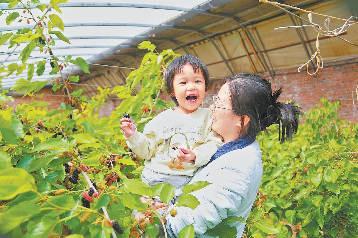 走进大棚,翠绿的桑叶层层叠叠,一串串饱满的桑葚隐匿其间。游客们提着果篮,穿梭在桑树间,小心翼翼地采摘成熟的果实。