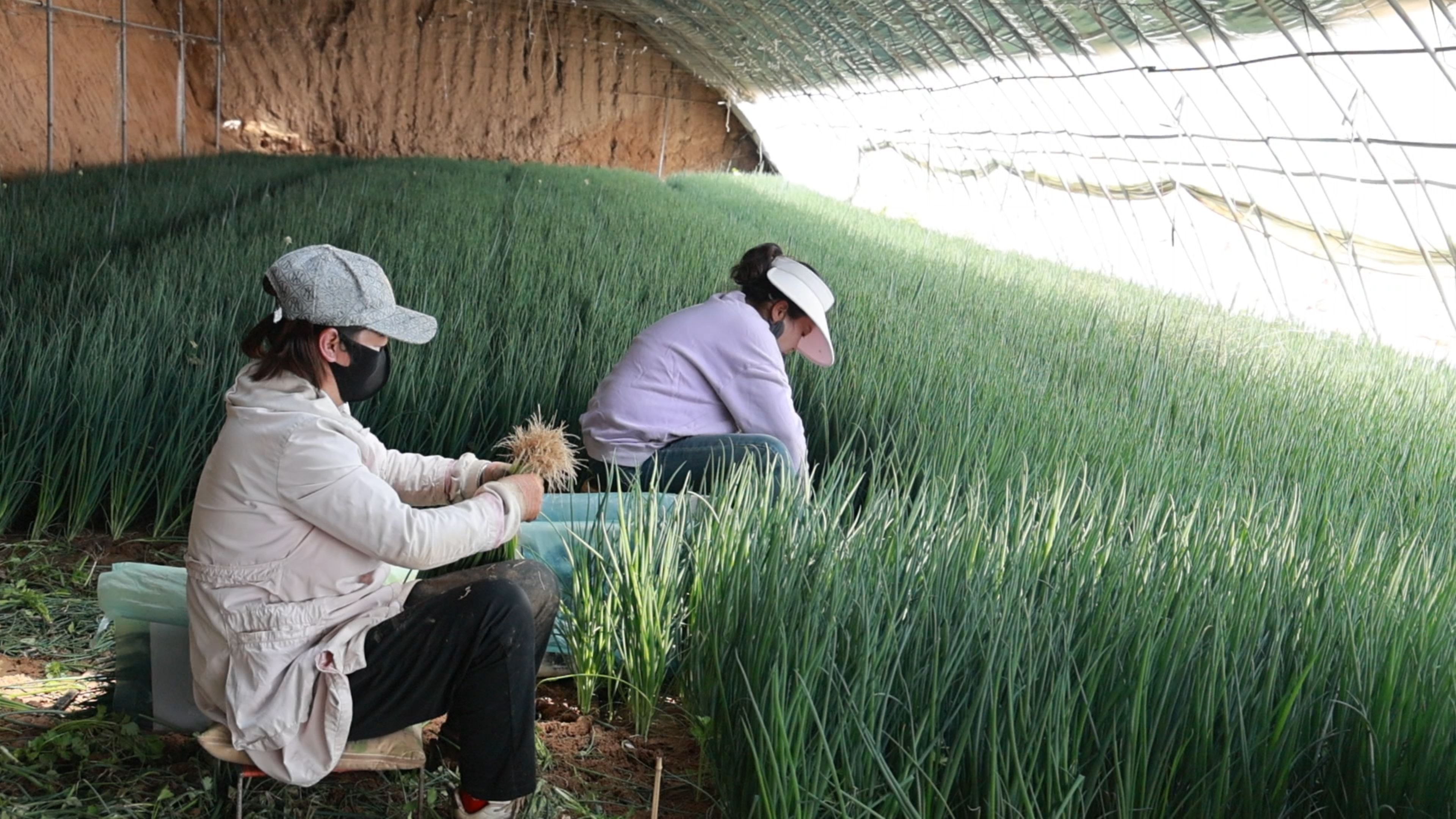 务工人员在白泥井镇公布井村大棚采收小葱。