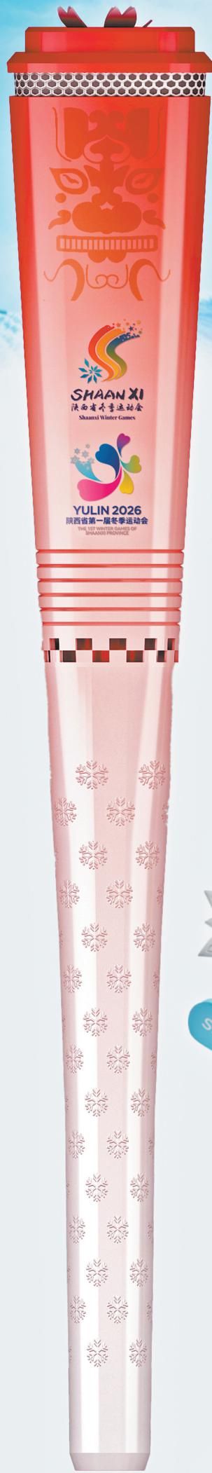 火炬的造型灵感来源于石峁遗址的双面神石雕,由奥运五环巧妙演化而成的同心圆环围绕;中段造型融入了“镇北台”的雄浑意象;手柄处点缀了雪花造型;火炬顶端是一朵盛放的桃花,凝聚着传统与现代、精神与梦想,正是今日榆林的生动写照。