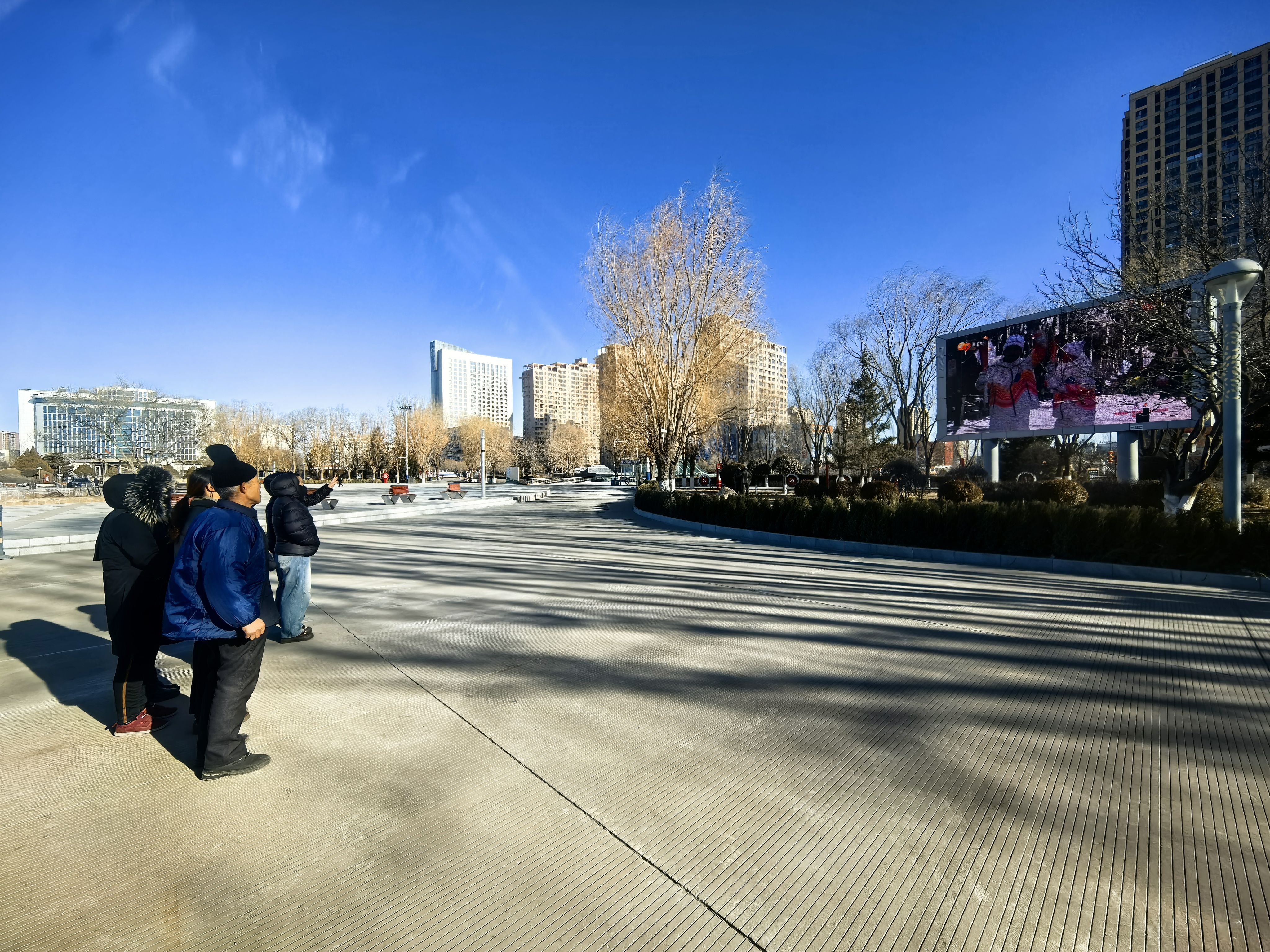 尽管冬日寒风凛冽,却丝毫未能阻挡市民迎接火炬的脚步。在榆林火车站广场,巨大的电子屏幕成为当天最热的“打卡点”。市民们纷纷驻足,仰头注视高清直播画面,目光追随着火炬在榆阳大地传递的每一步。