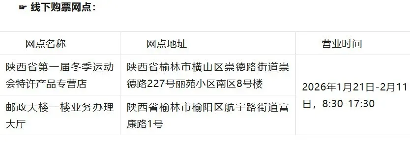 为方便市民观赛,省一冬会所有门票统一通过官方票务网站、票务小程序(陕西省第一届冬季运动会票务)及授权线下网点进行销售。同时,开通了票务咨询热线(0912-5050061/0912-5050062),切实保障广大群众的购票服务体验。