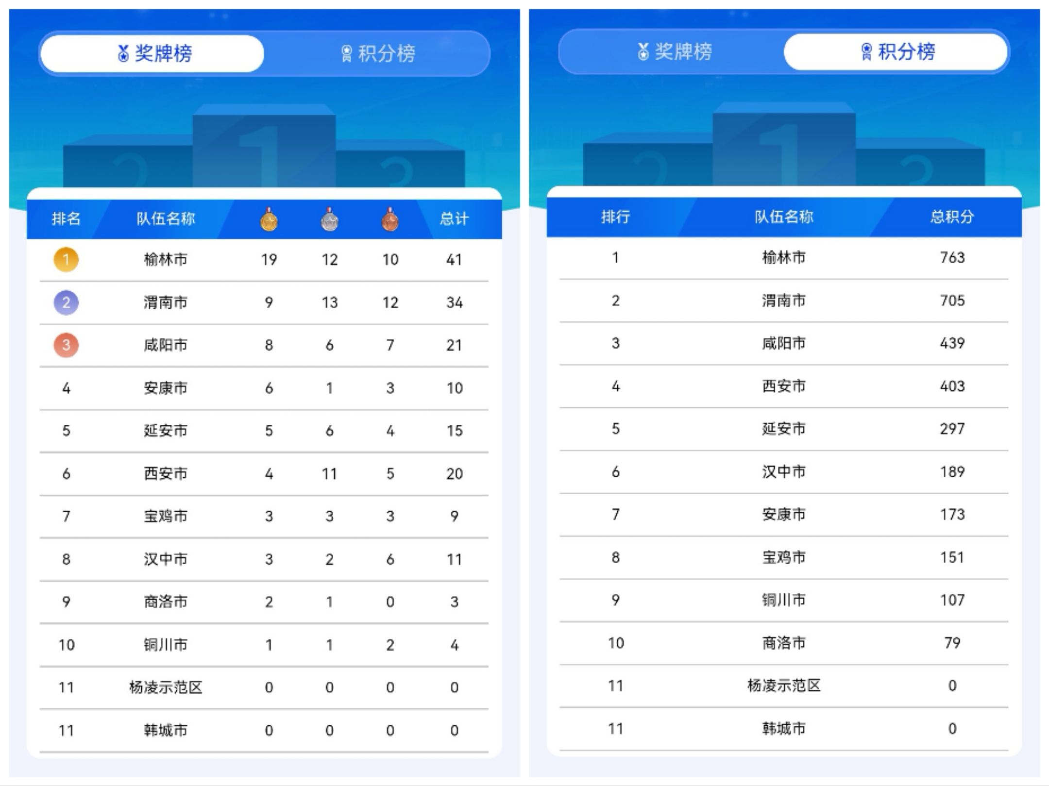 咸阳、西安、延安等代表队也在奋力冲刺,各展风采。杨凌示范区和韩城市目前暂未收获奖牌,期待后续发力!