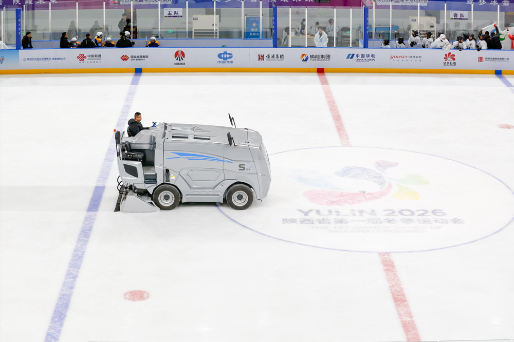 2月8日,省一冬会“陕西能源杯”(青少年组)冰球比赛间隙,制冰车缓缓驶过赛场对赛场冰面进行修整,为下一节的高强度对抗提供平整、安全的冰面保障。