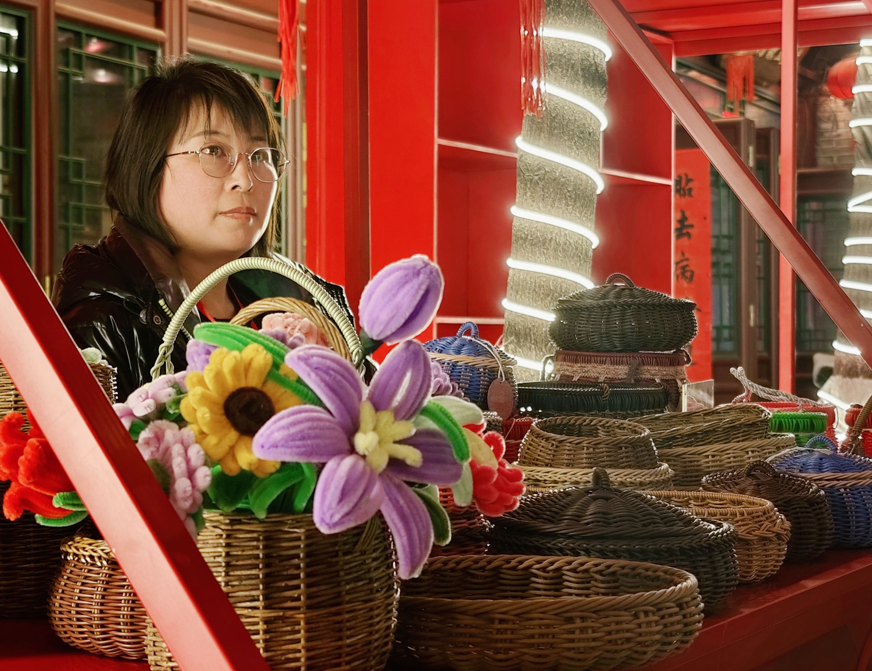 中国传统工艺美术大师、剪纸市级非遗代表性传承人曹宏霞则带来了马年主题作品与独创的套彩剪纸作品,她借助政府搭建的平台大胆创新,将榆宝宝、林贝贝、榆阳妞、陕北汉以及南塔北台等地域文化元素融入创作,既坚守民间艺术本色,又贴合年轻群体审美。展位前围满了好奇的年轻人,曹宏霞一边展示作品,一边分享起自己的创作心得:“这些就是我孙子从学校带过来的,小孩们喜欢这个可爱的,老人们喜欢一帆风顺、马到成功,有吉祥寓意的。在咱们政府搭建的非遗大平台里,我认为我们应该各显身手,用自己的手创新自己的作品,而且是年轻一辈喜欢的、吸引大家眼球的作品。”