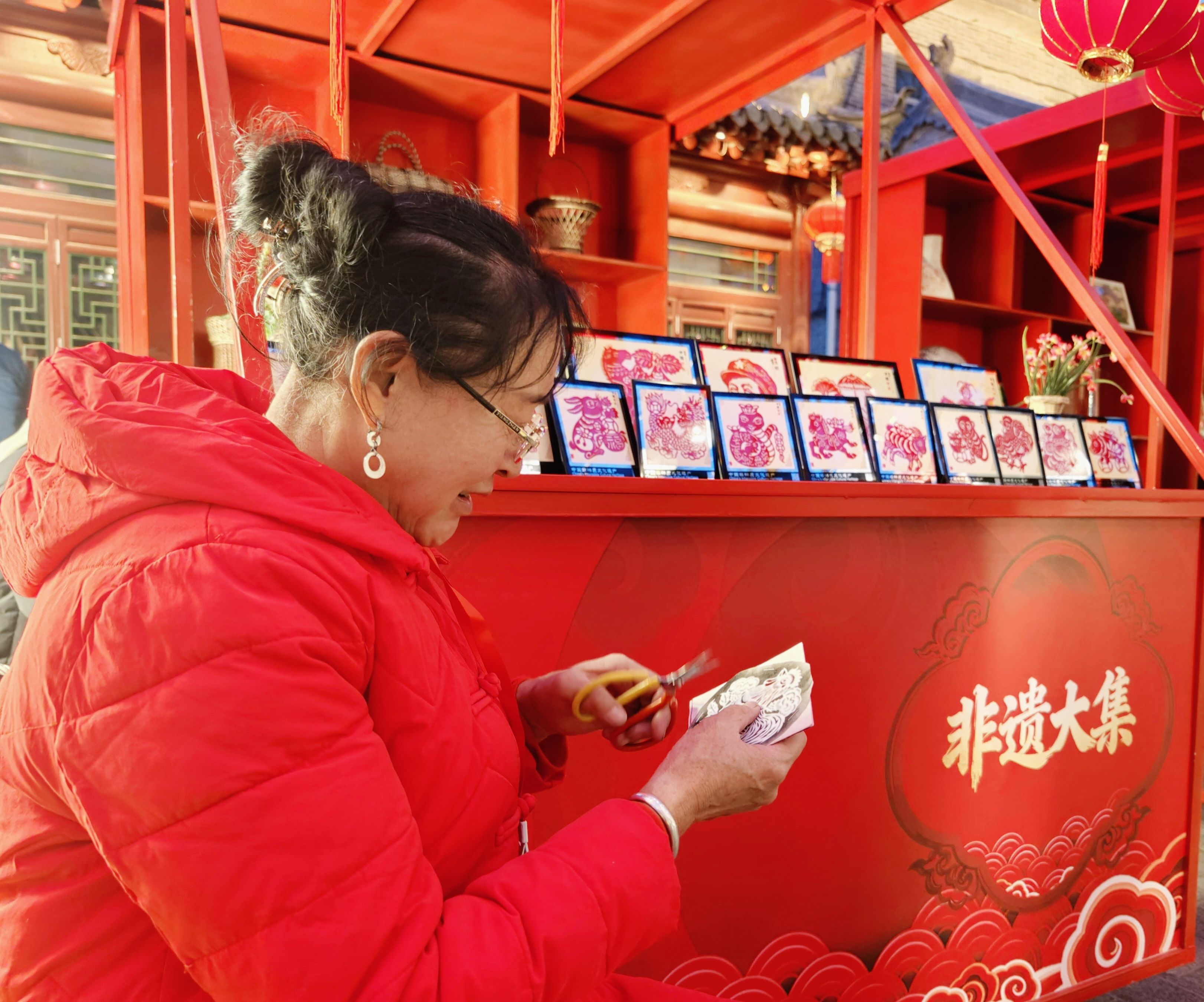 在榆林卫城大街,非遗大集的红色展位整齐排开,百米长的市集人潮涌动。这场非遗盛宴紧扣2026马年主题,在各类展品中融入丰富的“马”元素,剪纸、面花技艺传承人精心创作了形态各异、寓意吉祥的马造型作品,灵动矫健的骏马、“马上有福”的吉祥寓意,成为大集里不可忽视的存在。除特色生肖主题外,泥塑的浑厚质朴、石雕的精巧大气、刺绣的细腻精美,全方位展现了陕北非遗的深厚底蕴。同时,热闹的市集上,老手艺还勾起了市民的乡愁记忆,让文化传承的力量直抵人心。