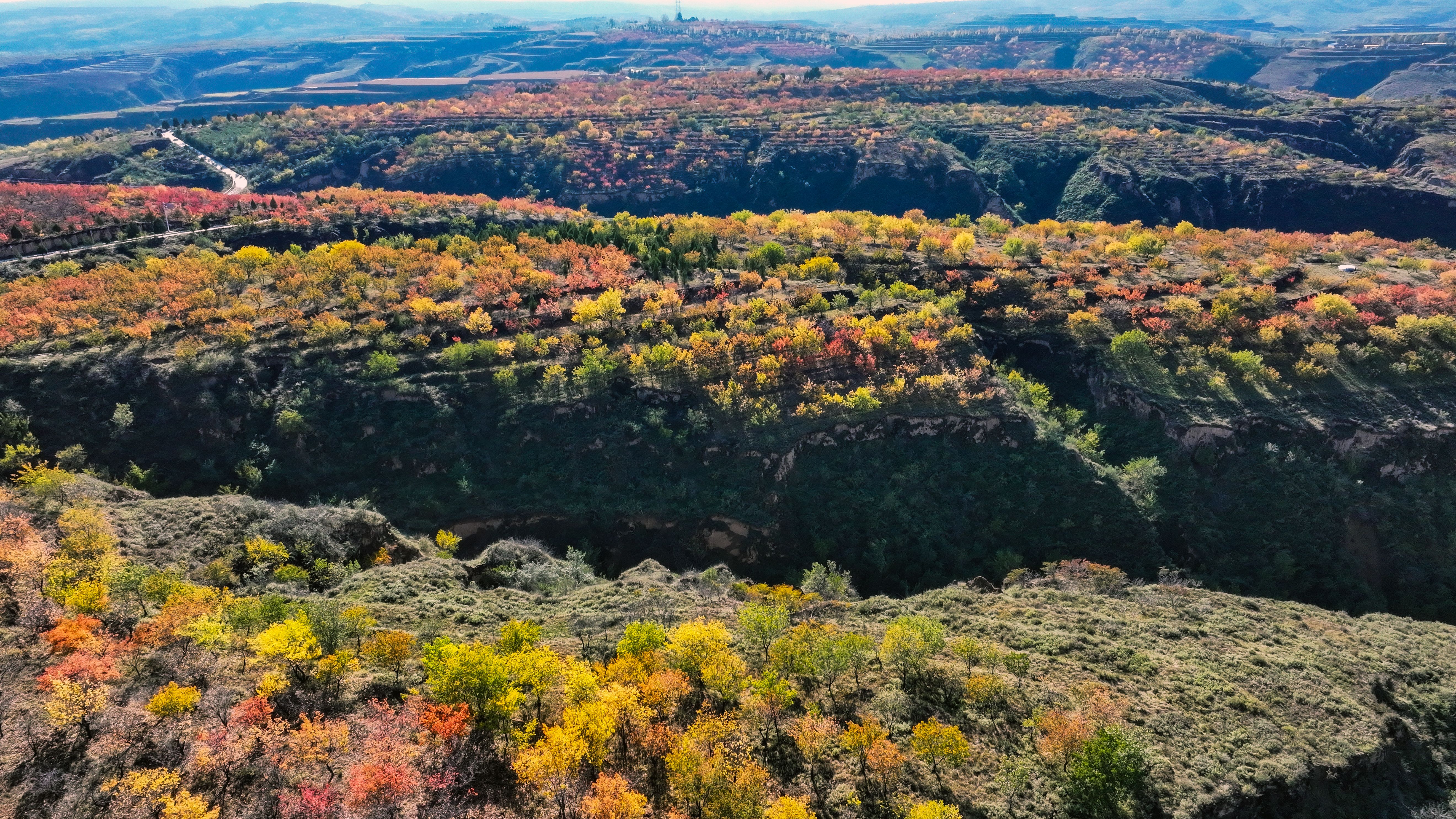 榆阳区古塔镇 的红叶景观以 大扁杏种植区 为主,每年10月至11月进入最佳观赏期,红叶覆盖山梁沟壑,形成如火如霞的自然景观。