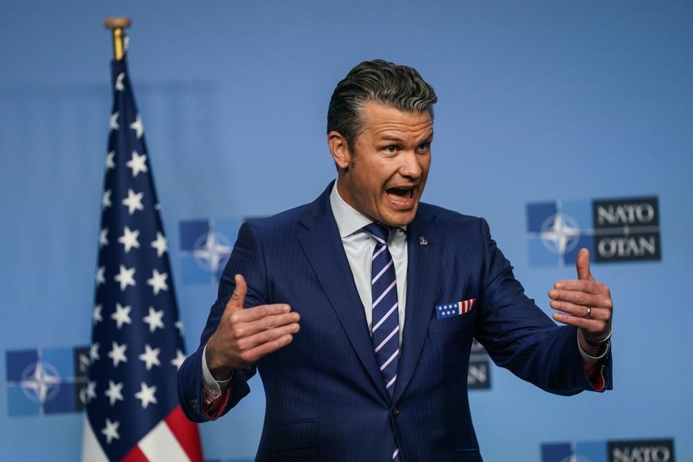 10月15日,在比利时布鲁塞尔,美国国防部长赫格塞思在记者会上发言。新华社记者彭子洋摄
