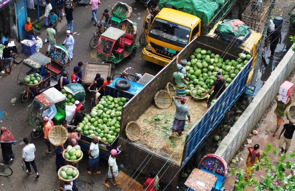3月30日,商贩在孟加拉国首都达卡一处市场出售西瓜。新华社发(哈比卜·拉赫曼摄)