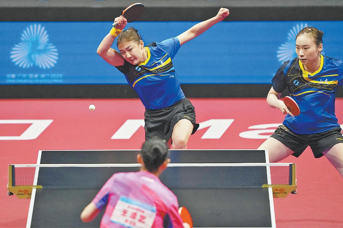 11月19日,山东队组合王晓彤/陈梦(上左)在比赛中。最终,她们3比0战胜河北队组合何卓佳/王添艺。