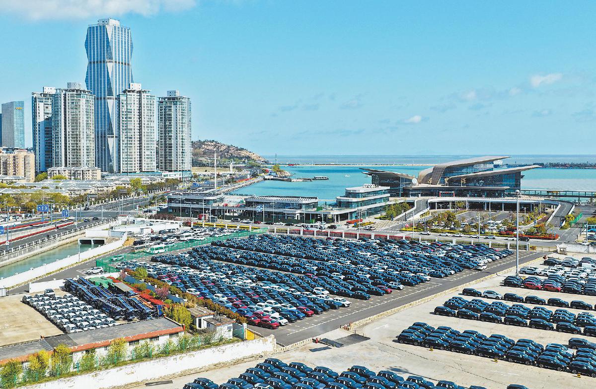 这是4月7日拍摄的江苏连云港港出口汽车堆场(无人机照片)。